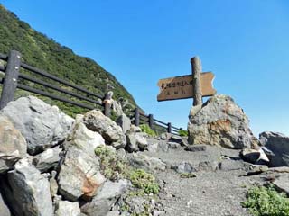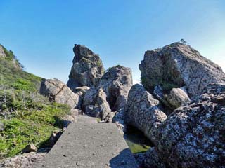 2012/9/25(9:00) 「エボシ岩」。 この「エボシ岩」も「斑レイ岩」でできており、 遠くから見ると「烏帽子」のように見えること から名付けられたという。 写真をクリックすると「エボシ岩」が 拡大表示(450x600)されます。 |