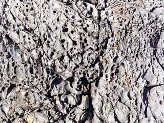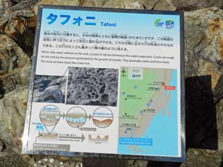 2012/9/25(9:09,9:09) 「タフォニ」。 「タフォニ」は、「岩に付着した海水が塩の結晶となり、結晶が成長する圧力で岩石に 割れ目ができ、その割れ目が広がり穴となり、穴が集まって蜂の巣状になったもの」とある。 左の写真をクリックすると「タフォニ」の説明(800x800)が表示されます。 右の写真をクリックすると「タフォニ」の接写写真(600x450)が表示されます。 |