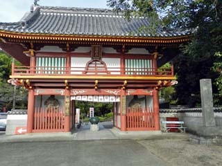 2012/9/24(8:08,8:08) 「極楽寺」入口の標識(左)と「仁王門(右)」。 標識には、「霊山寺(第1番札所)まで1.2km、金泉寺(第3番札所)まで、2.7km」とある。 「極楽寺」は、正式名を「日照山 無量寿院 極楽寺(にっしょうざん むりょうじゅいん ごくらくじ)」といい、四国八十八ヶ所霊場の第2番札所である。