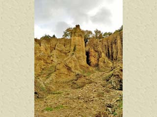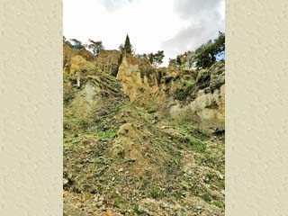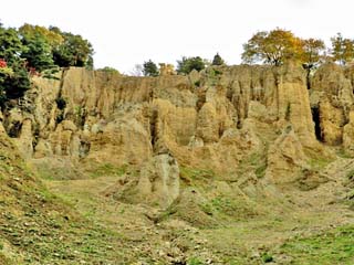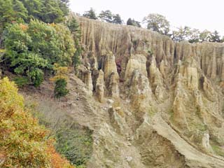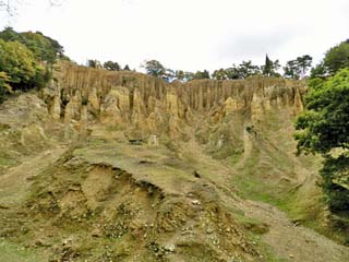 「身障者用駐車場」の近くで見る断崖。 写真の断崖は「土柱」とは呼ばないのであろうが、
