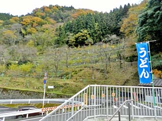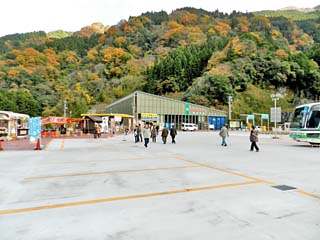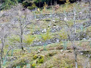 2013/11/26(15:30,15:32) 「祖谷のかずら橋」の駐車場と「棚田跡の石垣」。 国指定重要有形民俗文化財「祖谷のかずら橋」は、JR予讃線「大歩危駅」から車で東に約10.5km走った 「祖谷川」に架かる「葛類」を使って造られた原始的な吊り橋である。 全国から人の集まる観光地とあって、駐車場には普通車300台程が同時に収容できる。 「棚田跡の石垣」は、駐車場から「かずら橋」に向かう道の南側山の斜面にあり、平坦な土地が少ない、 この地区の急傾斜地に鍬を入れ石を積み上げ平らな土地にして、水田(棚田)を造ったという。 右の写真をクリックすると「棚田跡の石垣」の案内板が表示(800x600)されます。 |