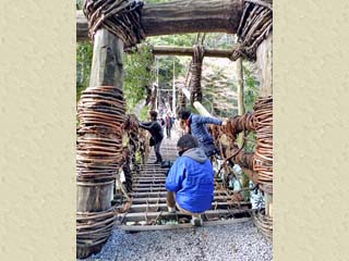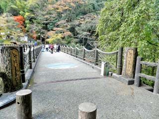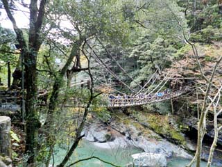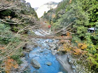 2013/11/26(15:37,15:40) 「祖谷渓大橋」から見る「かずら橋」。 橋の長さは45m、幅が2mで、水面からの高さは14m。重さ約5㌧の「シラクチカズラ」で造られている。 現在では安全のため、「カズラ」の中にはワイヤーが包み込まれているが、多くの観光客が乗るために 老巧化は早く、3年に一度、2週間から1ヵ月の期間をかけて架け替えられるという。 両写真共、クリックすると拡大写真(450x600,600x450)が表示されます。 |