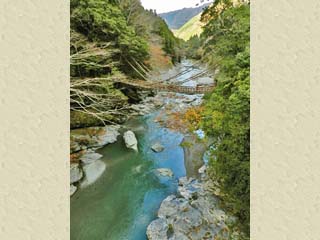 2013/11/26(15:48) 「祖谷川」上流側から見る「かずら橋」。 「祖谷のかずら橋」から、更に東へと車で約30km走った 「東祖谷」地区には、「奥祖谷二重かずら橋」があり、 雄大さ(怖さ)では「祖谷のかずら橋」に劣るものの、 2本の「かずら橋」と、その横には「野猿」と呼ばれる 人力の索道(ロープウェイ)が架かり、これらを何度でも 往復することができる。 興味のある方は下のハイパーリンクからどうぞ。 「奥祖谷二重かずら橋」のページへ |