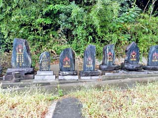 供養塔の周りに並ぶ石碑。 ほとんどの石碑には「梵字」が刻まれている。 写真をクリックすると一部を切り抜いた画像が 表示(600x450)されます。 |