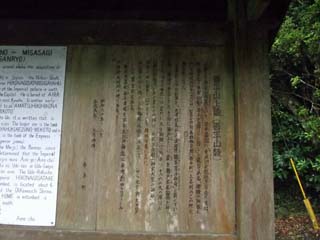 2011/6/2(8:39) 「昭和天皇行幸記念碑」の近くにある説明版。 「山陵」とは、帝皇の塚墓をいい、「吾平山上 陵」は、初代天皇神武天皇の御父君「鵜草葺 不合命(ウガヤフキアエズ)」と御母君「玉依姫 (タマヨリビメ)」の御陵といわれている。 |