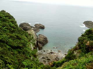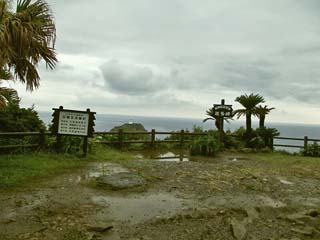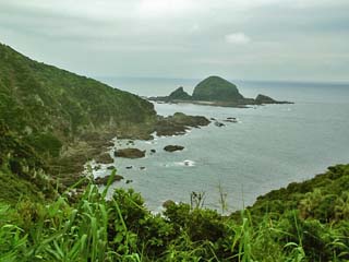 2011/6/2(11:21) 展望台から見る北側の景色。 「佐多岬展望公園」の入口から、展望台に続く遊歩道は、左側崖の上にある尾根状になった部分にあると思われる。 |