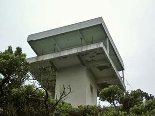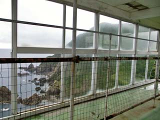 2011/6/2(11:23,11:24) 「半壊状態」の展望台。 下からは、窓も手摺りも見えなかったため、「どうなっているんだろう」とは思っていたのだが、 こんなにひどい状態になっていたとは思ってもいなかった。 2005年9月の台風14号の仕業だそうである。西側だけは辛うじて窓枠を残す(左の写真)が、 残りの3方は、窓枠が全て吹き飛ばされている。 |