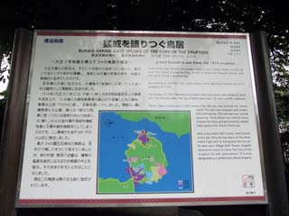 火山灰で高さ約3mの鳥居が、上部だけを残して