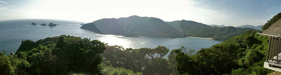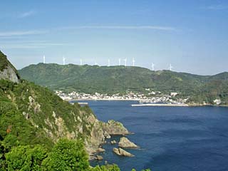| 2011/5/30(17:13) 「丸木崎展望所」から見る西側の景色。 写真左には「大瀬」「草島」と呼ばれる小島(岩)。右には「丸木浜」が見えている。 |