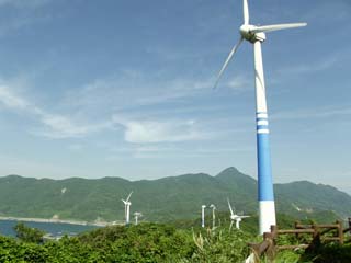 2011/5/30(15:59) 「展望台」から見る景色。 写真左は、西の方向。海に浮かぶ小島(岩)が「米島」で、ほぼ北の方向にある。右は、南東の方向である。 以下、「野間岬ウインドパーク展示館」で頂いたパンフレットより。 ・タワーの高さ:30mが8基。45mが2基。 ・プロペラの大きさ:直径約30m。 ・発電能力:300kw/1基。10基で、一般家庭の約1,000世帯分の電気を発電。 ・どうやって風をキャッチする?:風向きに合わせてプロペラの向きを変えて、もっとも効率的に風を受ける。 ・発電を始める風力:上の写真左方向にある1~5号機が、毎秒3.5m。右方向にある6~10号機が、毎秒2.5m。 (毎秒2.5mで、木の葉が動き、3.5mで、旗がゆらめく程度) ・台風などの強風でも発電する?:プロペラの破損等を防ぐため、プロペラの角度を変え、風を逃がした状態で停止する。 注:写真は、横が1,462ピクセルあります。写真直下にあるスクロールバーをご利用ください。 |