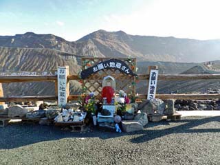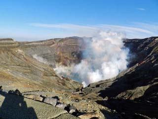 2012/11/25(8:39) 阿蘇山ロープウェイ「阿蘇山西駅」から見る 中岳火口方向の景色。 写真右には、ロープウェイの支柱が写る。 なお、「阿蘇山」という名前は、最高峰の高岳 (1,592m)を始め、中岳(1,506m)、根子岳(1,433m) 、烏帽子岳(1,337m)、杵島岳(1,326m)の五つの 山の総称であり、正式には「阿蘇五岳」という。 「阿蘇五岳」の中で、現在も噴煙を上げている のが、本ページで紹介する「中岳」である。