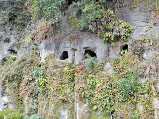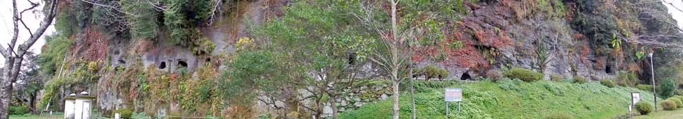 JR人吉駅北側の幅約800mの断崖に彫られる横穴群は、東西2群に分け、27基の横穴があるという。