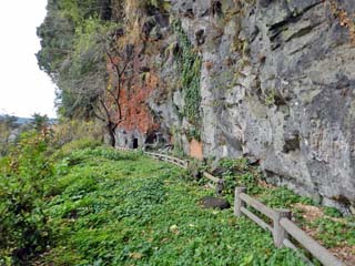 断崖下には、立入禁止の遊歩道が残り、横穴が点在する。 |