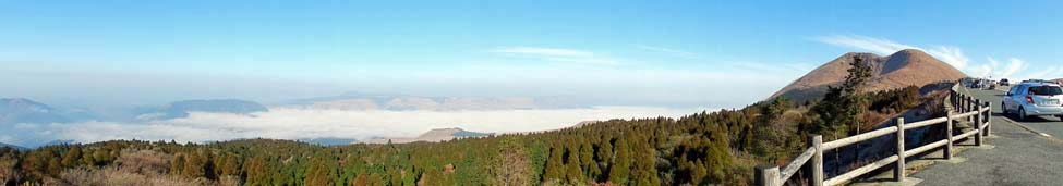 2012/11/25(9:42) 阿蘇五岳の最高峰「高岳」周辺の山々。 今でも噴煙を上げ続ける「中岳(標高:1,506m)」も、 この中にある。 |