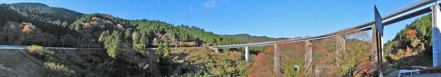 2012/11/27(8:55) 「人吉ループ橋」。 ループ区間の中にある駐車スペースから撮影。 「人吉ループ橋」は、熊本と宮崎の県境にある「加久藤(かくとう)トンネル」の熊本県側に位置するループ橋であり、昭和52年(1977)に完成。 ループ区間の長さは、1,190m。この間に半径95mから140mの3本の橋をループ状に架けることにより、緩やかな傾斜で標高差55mを乗り越える。 なお、「加久藤トンネル」の宮崎県側には、標高差75mの「えびのループ橋」があるが、こちらはループの中央に山があること等から、 ループの全体を見ることができない。 注:このパノラマ写真は、横が1,463ピクセルあります。写真直下にあるスクロールバーをご利用ください。 |