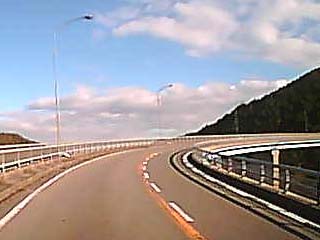 2012/11/27(8:56) 下のパノラマ写真で右上に写る橋上を走行中の景色。 この写真は、ドライブレコーダーの映像から切り抜いて います。 |