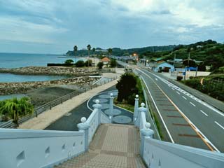歩道橋の上から見る国道324号線。 写真左の下に「四郎ヶ浜ビーチ」がある。 |