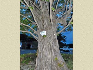 駐車場の中央に立つ姿に圧倒され、編み目のように絡み合う幹(気根?)は、「絞め殺し木」とも呼ばれる程で、始めてみる人は、その姿に驚くことであろう。