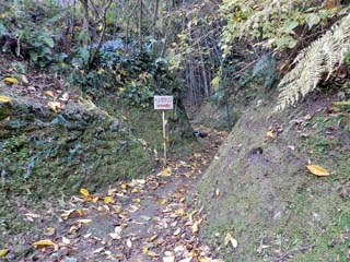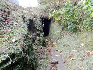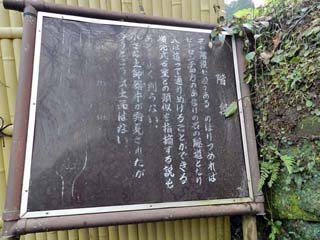 2012/11/24(14:32) 「階段」の説明。 本ページでは、「タンタン落し」の上にある、 トンネル(階段)から「鶯原神社」手前にある 最後のトンネルの間を紹介する。 なお、「タンタン落し」は、腰をかがめないと 通れないほどの大きさで、切石で築かれている という。 また、説明の都合上、「タンタン落し」を 第一のトンネルとし、この階段(トンネル)を 第二のトンネルと呼ぶ。 写真をクリックすると「説明版」が 拡大表示(450x600)されます。