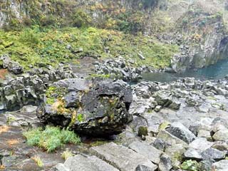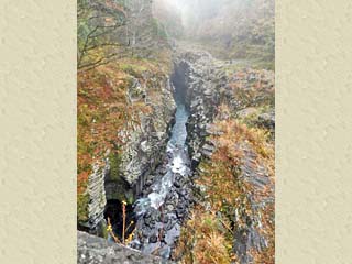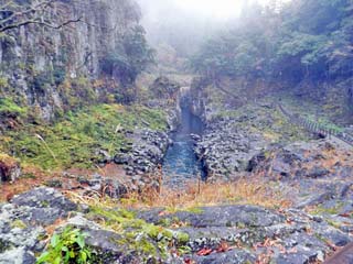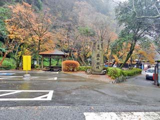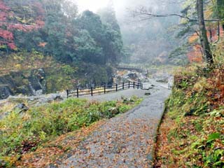 2012/11/26(7:33) 「あららぎ駐車場」に車を止め、「高千穂峡 遊歩道」へと歩く。 前方に「神橋」。車道右は「あららぎ乃茶屋」。 案内板には、「高千穂峡は、阿蘇溶岩の浸食谷」 とある。 写真をクリックすると「高千穂峡」の 案内板(600x400)が表示されます。