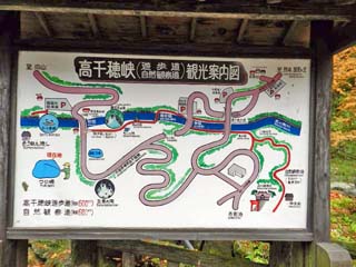 2012/11/26(8:13) 「御橋」左岸にある「高千穂峡観光案内図」。 このページで紹介するのは、「あららぎ駐車場」 から案内図を、左の方向へと歩き「槍飛橋」を 渡り、「御橋」までの片道600m弱を往復した 記録である。 なお、この案内図と同様のものは「神橋」の 近くにもあったのだが、文字が擦れていたため、 「御橋」左岸にあった案内図を掲載している。 このため、撮影時刻が前後しています。 写真をクリックすると案内図が 拡大表示(900x600)されます。