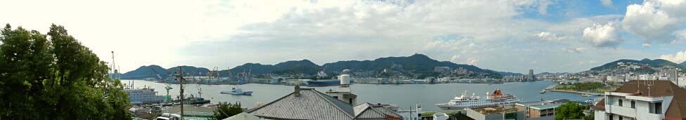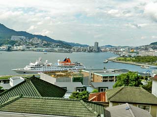 2013/10/2(14:25) 展望台から見る「長崎湾」。 写真中央右に、一番高く見える山は「稲佐山(標高:333m)」。 写真手前の「松が枝埠頭」には、大型客船が停泊している。 |