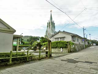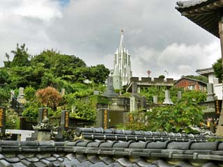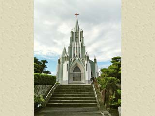 「平戸ザビエル記念聖堂」。 周囲を寺院に囲まれ、東洋と西洋文化が混在して 調和する、「平戸」のシンボル的聖堂である。 写真をクリックすると石段の上から撮る