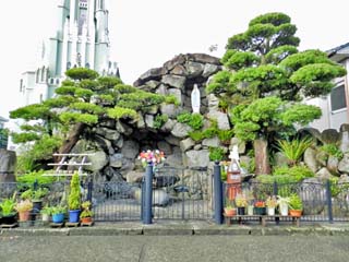「平戸ザビエル記念聖堂」前にある「ルルド」。 献堂75周年とザビエル生誕500周年を記念して、 この「ルルド」を建設したとある。 写真をクリックすると「ルルド」の案内板が 表示(600x600)されます。 |