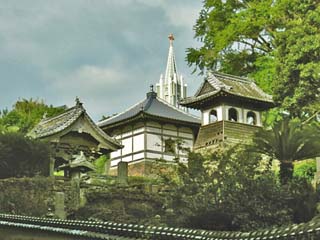 「光明寺」の境内から見る「平戸ザビエル記念教会」の 大塔。 |