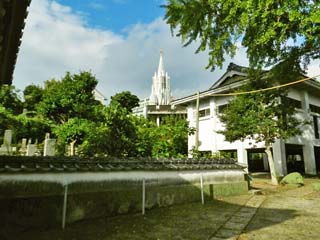 「寺院と教会の見える風景」。 3.75倍ズームにて撮影。 手前の建物は、「光明寺」の山門と、経堂、鐘堂。 写真をクリックすると拡大写真(600x450)が 表示されます。 |