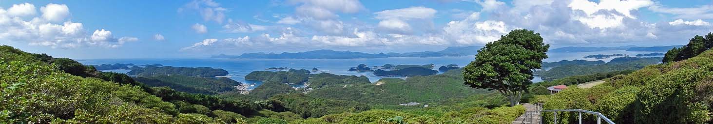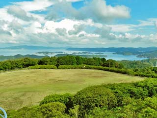 「長串山公園」から見る「北九十九島」と「平戸島」。 「長串山(なぐしやま)公園」は、佐世保駅から北西に約17km離れた「長串山(標高:234m)」の頂上付近にあり、「北九十九島」や「平戸島」を一望することができる。