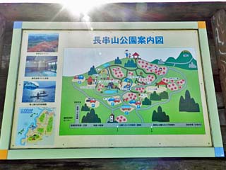 「長串山公園案内図」。 園内には、つつじ園の他、ローラーすべり台のある 「ちびっこ広場」やキャンプ場があり、イベント広場では、