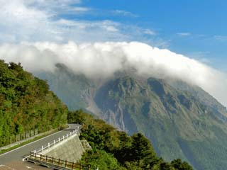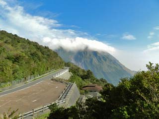 「仁田峠第二展望所」から見る「平成新山」。 2倍ズームにて撮影。 「平成新山」の山頂部(溶岩ドーム)は、雲に隠れる。 |