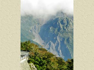 雲に隠れなければ、ロープウェイの支柱の辺りに 「平成新山」の山頂部(溶岩ドーム)が見える。 写真をクリックすると拡大写真(600x450)が 表示されます。 |