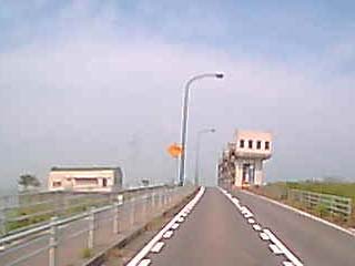 「南部排水門」。 この先、堤防の上に造られた道路となり、走行方向の 右側が「有明海」、左側が「調整池」となる。