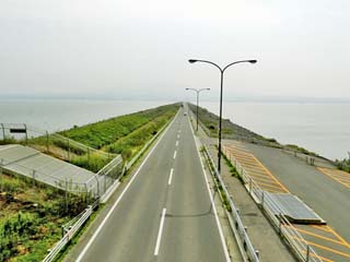 昭和27年(1952)、当時の食糧難を解決するために考えられた「長崎大干拓構想」に始まり、 平成元年(1989)に着工した「諫早湾干拓事業」では、諫早湾を7kmに渡り横断する堤防を構築、 平成9年(1997)には、「有明海」と「調整池」の間が、この堤防により分断された。 「諫早湾干拓堤防道路(雲仙多良シーライン)」は、この堤防の上に造られた通行無料の一般道路で、