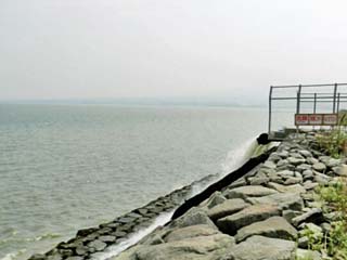 この写真では、「有明海」が、本来の海の色。 「調整池」は、白っぽく濁ったように見える。