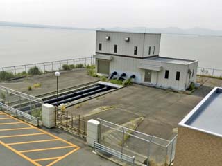 「展望歩道橋」から見る「吾妻町(南)」側の景色。 左が「有明海」。右が「調整池」である。