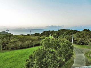 「展望塔」から見る南西方向の景色。 ほぼ中央に「御床島(みとこじま)」、その右に「鶴崎」が 見えている。