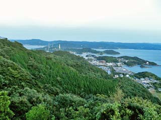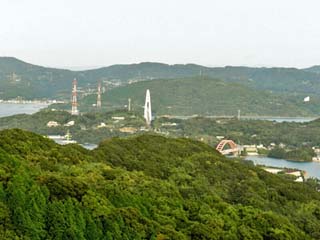 「展望塔」から見る東方向の景色。 写真奥に「西彼杵半島」。その手前には「呼子ノ瀬戸」に架かる「大島大橋」の白い主塔が見えている。