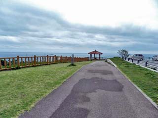 「知念岬公園」の展望台も同じく「知念体育館」の裏にあり、右の写真「展望台」の右方には駐車場の車も写る。 |