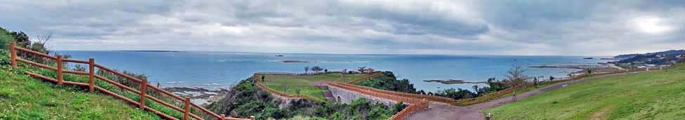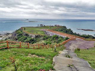 「知念体育館」と「知念岬公園」の展望台。 「知念岬公園」は、沖縄本島南部の東側「南城市知念」にあり、「知念岬」から東に5km程の沖合に浮かぶ、 「久高(くだか)島」が一望できると共に、日の出のスポットとしても知られ、元旦には多くの人が初日の出を 見るために訪れるという。