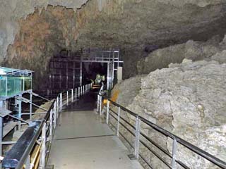 2015/4/9(16:14) 「玉泉洞」の出口手前。 「玉泉洞」入口の階段を降りてから800m強の間、 一度として途切れることなく続いた、「石筍」「つらら石」 「石柱」等の鍾乳石であったが、この出口付近だけは、 普通の「岩窟」の様相となり、洞くつの中に棲む 生き物達の水槽が並べられていた。 |