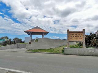 「辺戸岬園地」の標識。 「沖縄島最北の園地」とある。 |