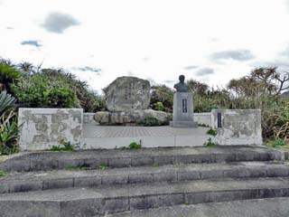 石碑の並ぶ台地から見る「ねはん像」。 写真右には、「辺戸岬園地」入口にある展望台の オレンジ色の屋根が写る。 写真をクリックすると「ねはん像」の説明が 表示(600x450)されます。