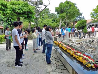 「ひめゆりの塔」に手を合わせる人たち。 手を合わせる人たちの中には、若い人も少なくはない。