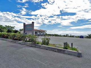 「茅打ちバンタ園地駐車場」。 案内板の奥に写る建物は、公衆トイレ。 |
