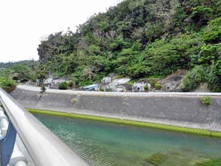 「奥橋」と奥橋の対岸に見る「亀甲墓」。 「奥集落の亀甲墓」は、国頭郡国頭村の奥集落にあり、「奥川」が海に注ぐ河口近くの右岸にある。
