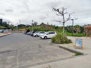 「古宇利大橋」南詰めの駐車場。 駐車場は、「屋我地島」側の道路脇にある。 |