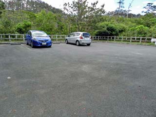 「ヤンバルクイナ展望台」の駐車場。 沖縄に多い「家形墓」が道の左右に並ぶ中を右折。 幅の狭い急坂を登ると、この駐車場に着く。 |